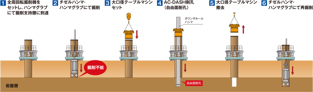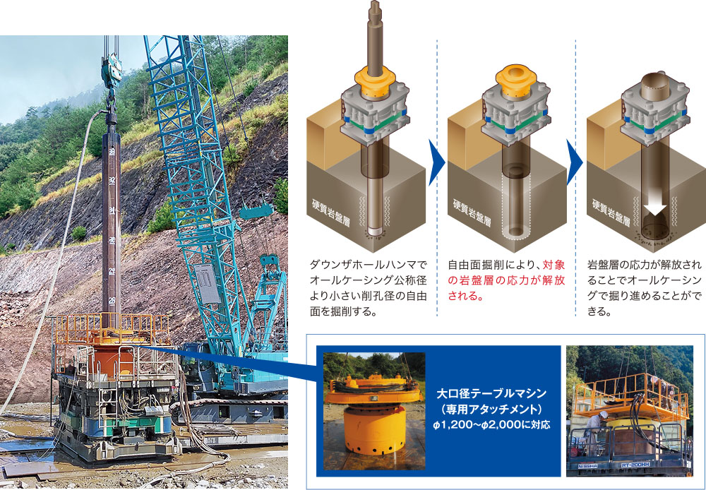 - 岩盤を自由面掘削することで応力が解放し、オールケーシング掘削が可能になります。