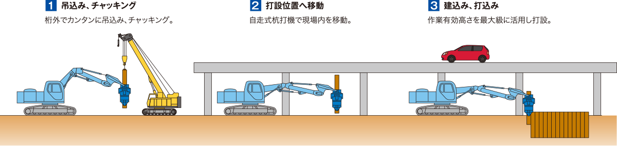 - センターホール式なので、桁下の有効長と同じ長さの杭まで打設できます。