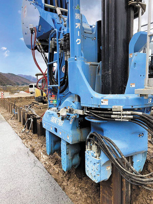硬質地盤クリア工法とは、砂礫・玉石や転石などの硬質な地盤に対して鋼矢板を圧入するための工法です。圧入機と一体制御のパイルオーガで杭先端の直下地盤を掘削し、貫入抵抗力を低減させながら杭を圧入します。この芯抜き理論により、N値50以上の地盤でも施工可能です。また、周辺環境への影響を最小限に抑え、安全性も確保されます。