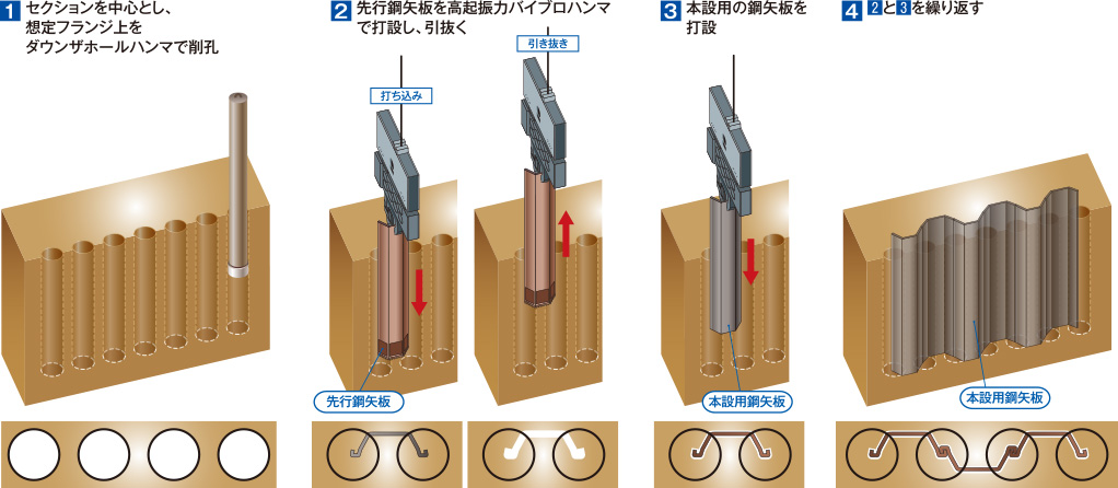 本技術はダウンザホールハンマでの削孔箇所を鋼矢板の想定フランジ上に限定し、それ以外の部分は先行鋼矢板の強制圧入・引抜きにより破砕してから本設用鋼矢板を打設します。ラップ施工を行わず、削孔箇所が最小限であるため、鋼矢板の自立性も向上します。また、鋼矢板の突出長が長い、根入れ長が短いといった現場にも有効です。