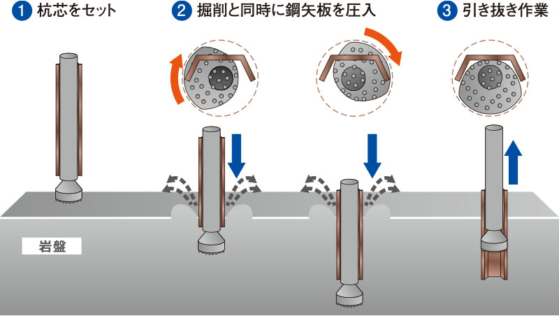 偏芯ビットが可能にした鋼矢板岩盤同時圧入工法