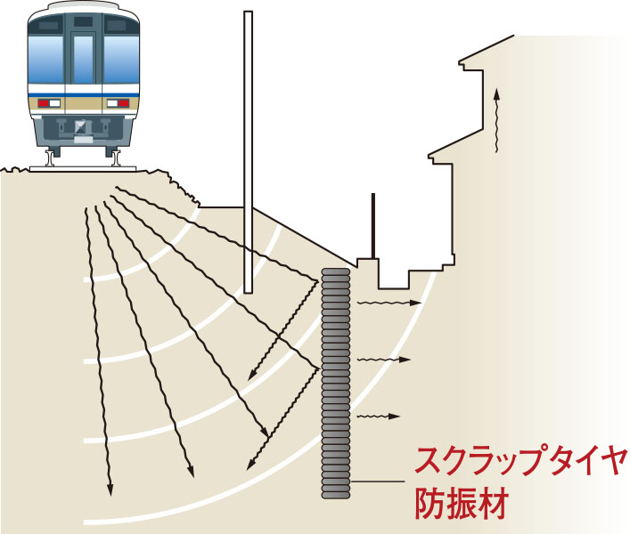 この新工法は、スクラップタイヤ防振壁を地中に構築することで、さまざまな環境振動を低減。また、年間約100万トン以上も発生しているスクラップタイヤを燃やすことなく再利用できるため、温室効果ガス(CO2)の排出削減にも効果的です。