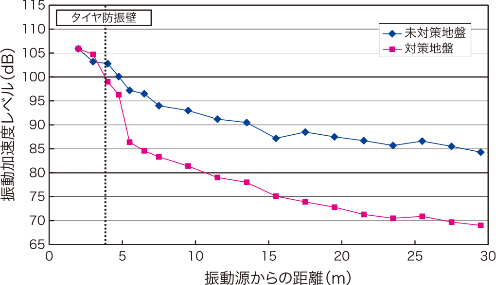 振動測定結果を図に示します。スクラップタイヤ防振壁を施工した地盤では未施工地盤と比較して5~15dBの振動低減効果を示しました。また、振動源から約30m離れた地点でも優れた防振効果を示すことも確認されました。