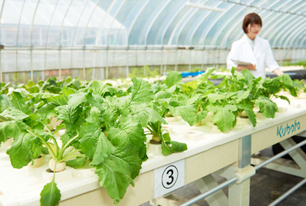 水耕栽培による低カリウム根野菜の栽培方法の研究を行っております。初めに実験の計画をたて、それに従って水耕溶液の調合、野菜の栽培を行います。効率的に実験を行うために、期間をずらして同時進行で何種類もの野菜を育てています。