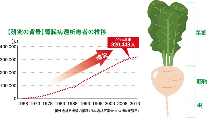 様々な野菜や果物の低カリウム化研究が進められていますが、根菜の低カリウム化はあまり進んでいませんでした。そこで、根菜を対象に、低カリウム化に取り組みました。