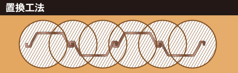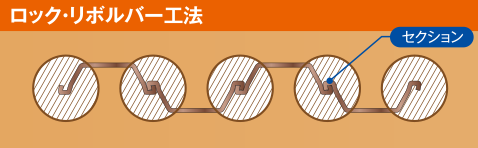 ロック・リボルバー工法は、硬岩相当の硬質地盤に対して鋼矢板を打設することができる技術です。従来はダウンザホールハンマや全周回転掘削機による置換工が用いられていましたが、削孔点数や削孔範囲が大きく、特に水上でのラップ施工は高い技術が必要でした。