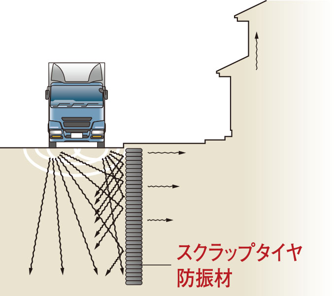 この新工法は、スクラップタイヤ防振壁を地中に構築することで、さまざまな環境振動を低減。また、年間約100万トン以上も発生しているスクラップタイヤを燃やすことなく再利用できるため、温室効果ガス(CO2)の排出削減にも効果的です。